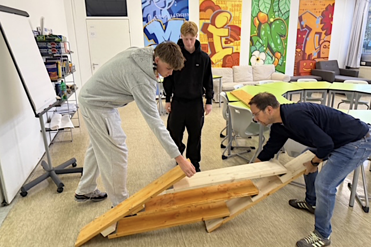 Zusammen mit Fachlehrer Torsten King ging es in der Holzwerkstatt der Schule ans Werk. Mitten im Geschehen waren die Schülerinnen und Schüler. Zunächst erstellten sie, begleitet durch die zwei Experten, in einer CAD-Zeichnung eine computergestützte 3-D-Konstruktion. Dann wurde daraufhin ein kleines Modell gebaut und nach dieser Vorlage entstanden schließlich zwei einsatzfähige Regale. Die besondere Herausforderung dabei war, dass der Regaltyp zusammenklappbar sein sollte.