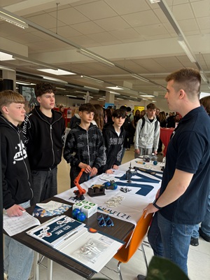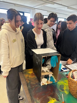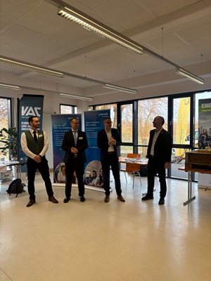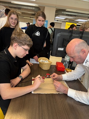 Am 25. und 26. März bot die Bertha-von-Suttner-Schule unter der Organisation der Kollegen Matthias Stein und Andreas Dotzauer sowie des Berufsmesseteams den Schülerinnen und Schülern der 8., 9. und 10. Klassen mit der bereits 8. Berufsmesse Orientierung und Unterstützung. Dabei unternahm die Schule außerdem einen tatkräftigen Schritt gegen den Fachkräftemangel in der Umgebung. Denn insgesamt 55 Institutionen waren mit ihren Vertreterinnen und Vertretern zu Gast in der Schule - regionale Unternehmen aus Handwerk und Einzelhandel, Dienstleister aus verschiedenen Branchen, zum Beispiel das Autohaus Staaf, die Bundeswehr, Schick Industriebau, Systeex oder das Tutto Café, Kreis- und Stadtverwaltungen sowie weiterführende Schulen, wie die August-Bebel-Schule. Ausgestattet mit umfangreichem Informations-, Anschauungs- und Übungsmaterial standen die Aussteller den Schülerinnen und Schülern Rede und Antwort – mit dem Ziel, potenzielle Auszubildende für ihre Betriebe zu gewinnen. Die meisten Unternehmen stellten den Jugendlichen dafür sogar interessante Testobjekte zum Üben zur Verfügung, sodass sie in den jeweiligen Berufszweig aktiv hineinschnuppern konnten. Die Schülerinnen und Schüler konnten in der Mensa so beispielsweise Steine verlegen, erste Hilfe an einer Hundefigur üben oder Drähte löten. Diese interaktiven Angebote schufen eine gute Atmosphäre, in der die Schülerinnen und Schülern unkompliziert mit den Unternehmensvertretern ins Gespräch kamen. Darüber hinaus konnten sich die Jugendlichen ein besseres Bild davon machen, welche Tätigkeiten bestimmte Berufe beinhalten und erhielten neue Impulse für die eigene Berufswahl. Die Bertha-von-Suttner-Schule bedankt sich bei allen beteiligten Unternehmen herzlich für die wertvolle Zusammenarbeit. Besonders hervorzuheben ist das Engagement der Helfenden aus dem Team sowie der 10er A-Klassen, deren Einsatz die Veranstaltung erst möglich gemacht haben. Bitte beachten Sie auch den Bericht des Hanauer Anzeigers zur langen Nacht der Ausbildung, die im Kontext der diesjährigen Berufsmesse erstmalig in Kooperation mit der Bürgerstiftung und dem „Stadtmagazin mein Nidderau“ erstmalig durchgeführt wurde. Bericht: Julia Hiekel und Harald Klose Fotos: Julia Hiekel