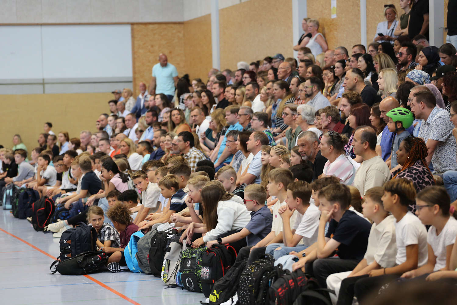 In der vollbesetzen Sporthalle hieß Schulleiter Harald Klose die neuen Mitglieder der Schul-gemeinschaft, ihre Eltern und Verwandten in zwei Durchgängen willkommen. Ein besonderes Highlight dieses Jahrgangs: Erstmals starten Profilklassen mit dem Schwerpunkt MINT und Medien. Dieses Angebot fand bei den Eltern und Kindern so großen Zuspruch, dass gleich drei Profilklassen eingerichtet werden konnten – neben einer Musikklasse, einer Klasse mit dem Schwerpunkt Sprache und Darstellendes Spiel, einer NaWi-Klasse sowie zwei Kunstklassen.