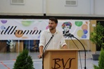 Der Schulleiter machte den Neuankömmlingen deutlich, dass sie nun auch dazugehören und als „Bertha-Botschafter“ das Gesicht der Schule nach außen tragen. Er erinnerte an die Namenspatronin Bertha von Suttner, die einst betonte: „Nach lieben ist helfen das schönste Tu-Wort der Welt.“ Daran anknüpfend schwor er die Kinder ein: „Lasst uns gemeinsam dafür sorgen, dass helfen immer an zweiter Stelle steht – gleich nach lieben.“ – Damit eine Gemeinschaft bestehen bleibt, auf die die Schule mit Stolz blicken kann.
