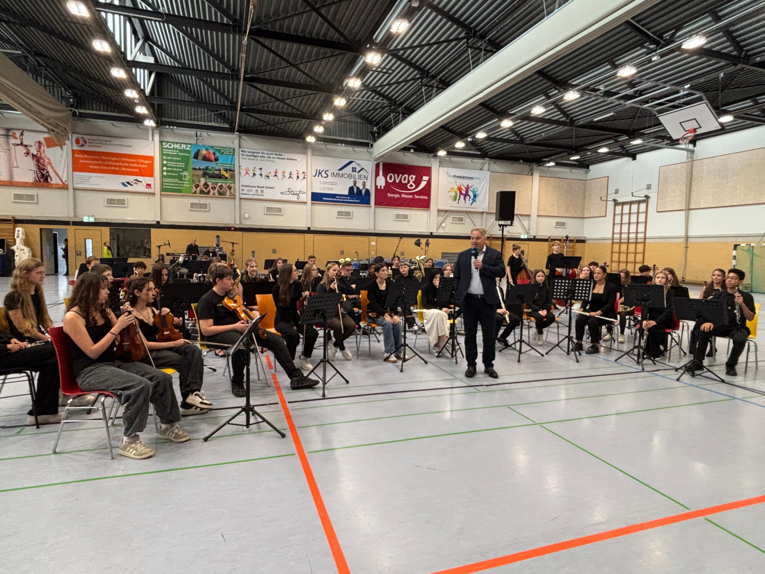 Das Schulorchester stimmte mit drei Kompositionen in die Veranstaltung ein, geführt von den Lehrkräften Susanne Riedl-Komppa, Peter Ripkens und Roman Mixa.