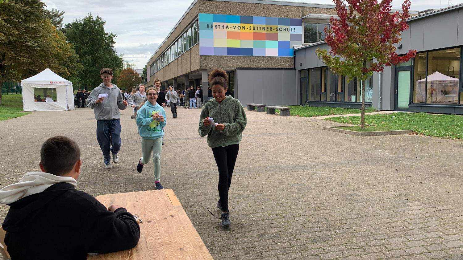 Und das machten die Jugendlichen trotz des grauen, kühlen Wetters mit Freude und Elan. Ob Laufen oder zügiges Spazierengehen - dabei taten sie nicht nur etwas für ihre Gesundheit, denn jede Runde um die Schule brachte den Schülerinnen und Schülern etwas Geld von ihren Sponsoren. Je mehr Runden sie gelaufen waren, desto mehr konnten sie sammeln – für sich und ihre Schule, aber auch für einen guten Zweck. Jeder Jahrgang lief in einer Schulstunde, unterstützt von den Sportlehrkräften Hanna Turkovic und Janez Cevka, die auch als Vertrauenslehrer tätig sind.