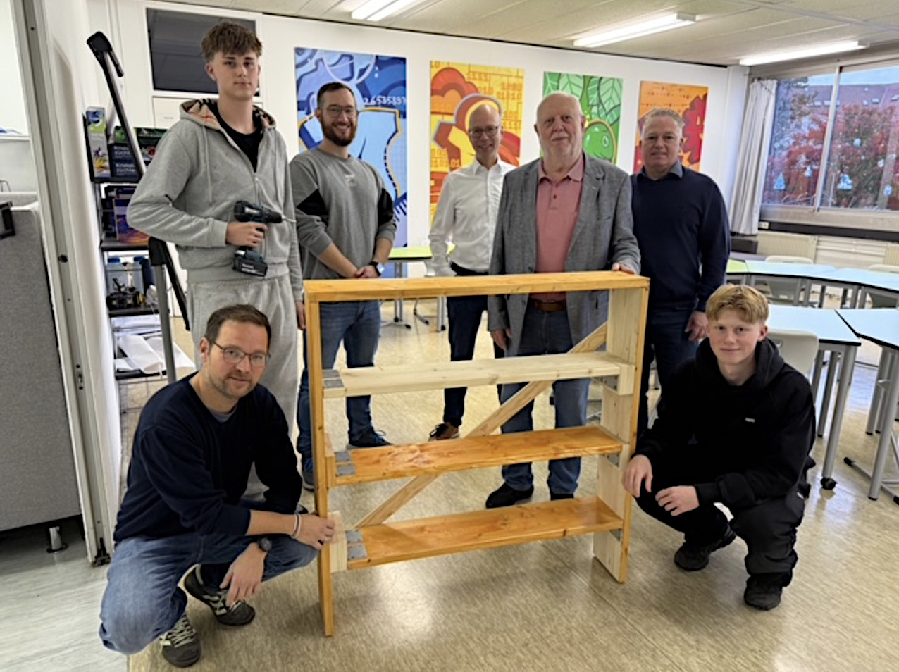 Das Ergebnis lässt sich sehen: zwei stabile, aber leicht zusammenhaltbare Holzregale. Sie erhalten nun noch einen fertigen Anstrich und werden dann an Matthias Stein, Leiter des MINT-Zentrums übergeben, der sich über das praxisorientierte Bildungsprojekt im Programm des Zentrums freute, das der Förderverein der Schule durch Treffen im letzten Jahr vermittelte.
