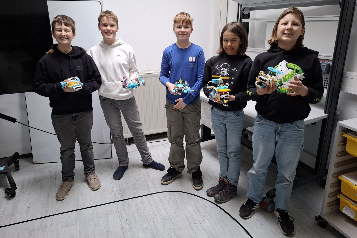 Leiter der AG und des MINT-Zentrums, Matthias Stein, teilt stolz die Neuigkeiten zum Roboter-Bau. Ziel war es, fahrende Roboter zu bauen, die auf einer schwarzen Linie entlangfahren, ohne dass sie sich gegenseitig rammen - also Abstand halten. Das ist den Schülerinnen und Schülern wunderbar gelungen. Zur Vorbereitung hatten sie einen Roboter mit einer Zange gebaut und Gegenstände transportiert sowie eigene kleine Projekte zur Übung bearbeitet.