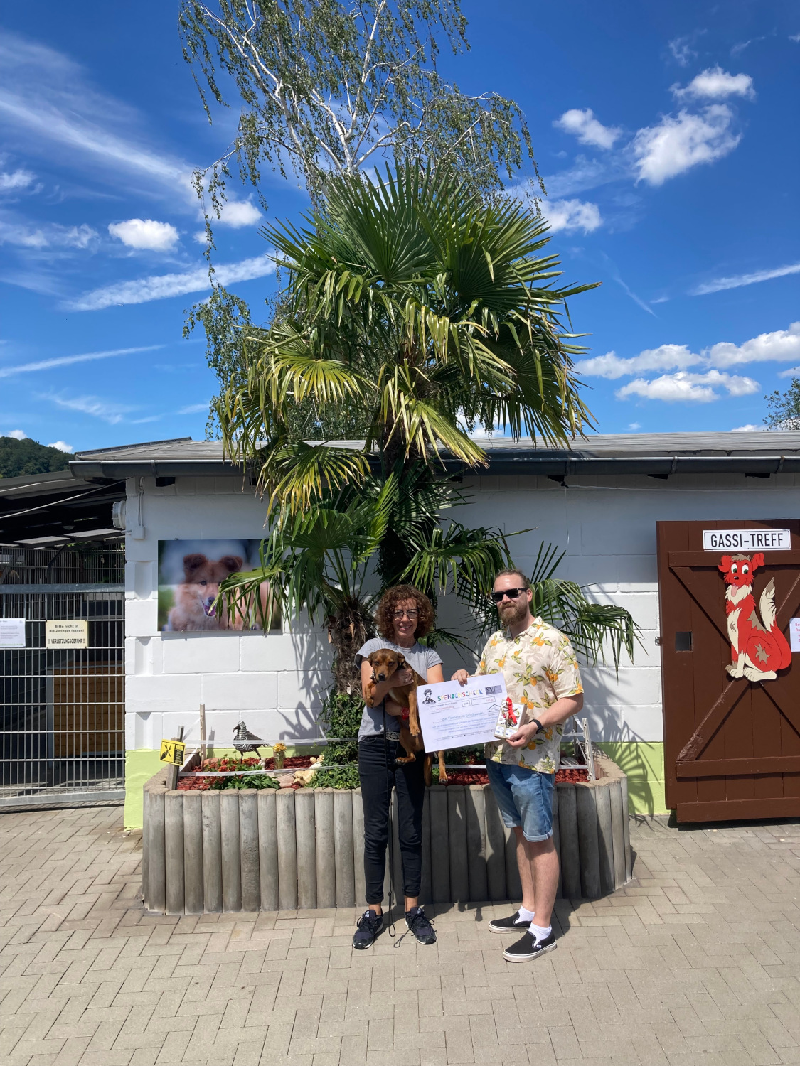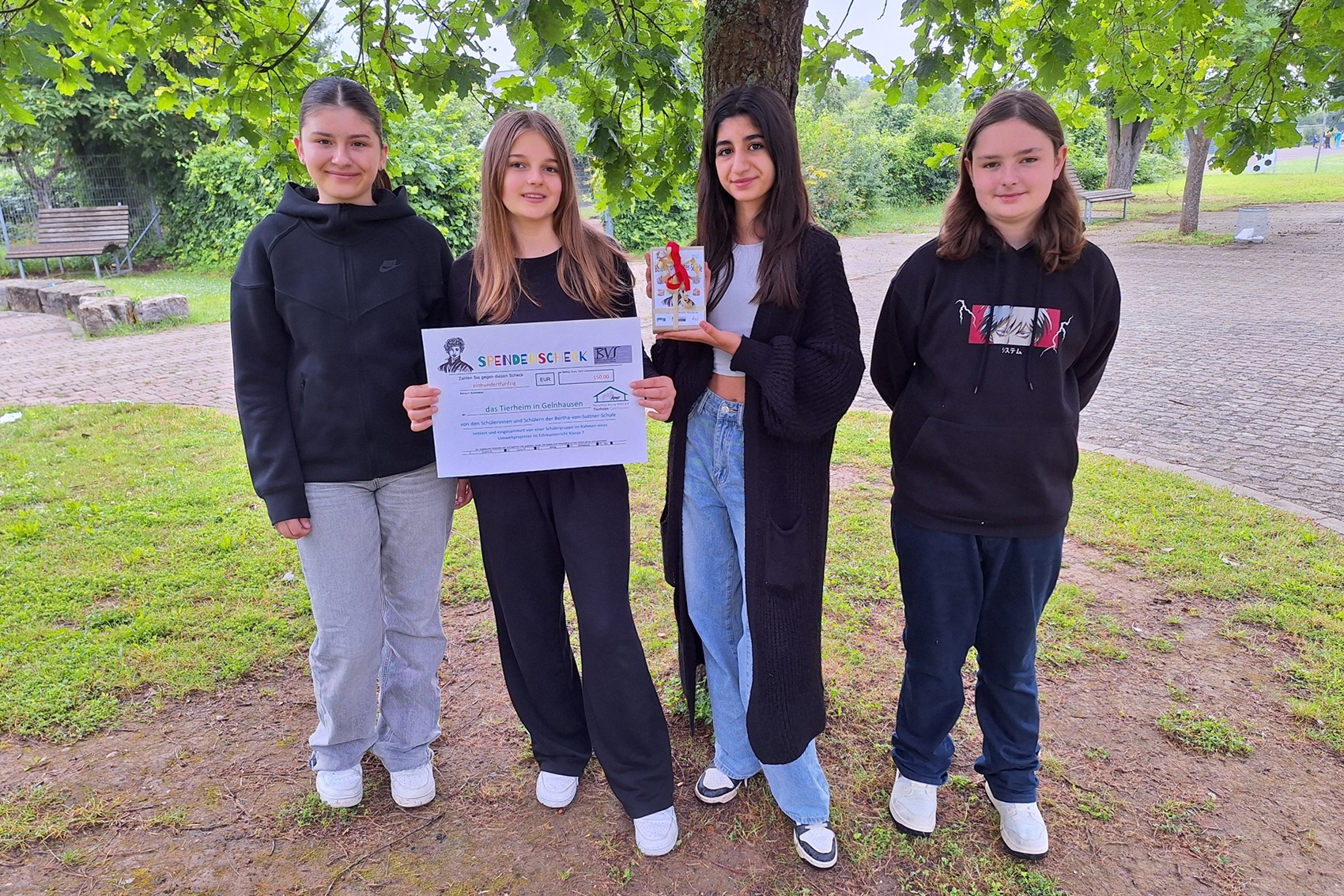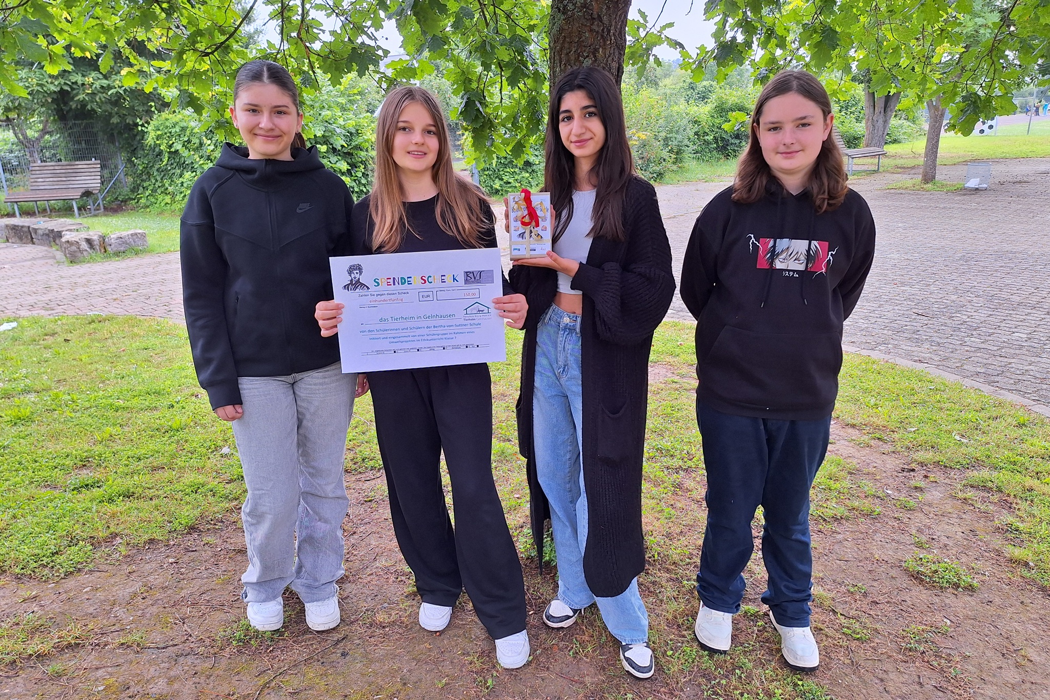 Über eine Geldspende von einhundertfünfzig Euro konnte sich Jeannine Voll-Kreis, Leiterin des Tierheims Gelnhausen, dieser Tage freuen. Die Schülerinnen und Schüler der beiden Ethikkurse der Bertha-von-Suttner-Schule Nidderau hatten das Geld gesammelt, nachdem sie im Unterricht verschiedene Aspekte von Verantwortung, Engagement und aktiver Hilfeleistung gegenüber ihrer Umwelt thematisiert hatten. Um die Diskussion in praktische Projekte umzusetzen, bauten sie anschließend in der Holzwerkstatt Nisthilfen und Vogelfutterhäuschen, gestalteten Upcycling-Kunstwerke und starteten innerhalb der Schule eine Spendenaktion für den Tierschutz. Stellvertretend für die Schülerinnen und Schüler sowie seine Kollegin Andrea Sinn überbrachte Studienrat Fabian Heidlberger den symbolischen Scheck und die Spendenbox an die Leiterin des Gelnhäuser Tierheims, die sich über das unerwartete Geschenk sehr freute und im Namen ihrer vierbeinigen Schützlinge den Schülerinnenn und Schülern ein herzliches Dankeschön für ihr Engagement schickte. Foto 1 (von links): Vier der an der Spendenaktion beteiligten Schülerinnen Milena Baumbach, Sarah Bregel, Dilay Bayar, Mikosch Fonken; es fehlen Leonie Kniß und Bang Nhi Nguyen. Foto 2: Jannine Voll-Kreis (Tierheim Gelnhausen), Fabian Heidlberger (BvS)