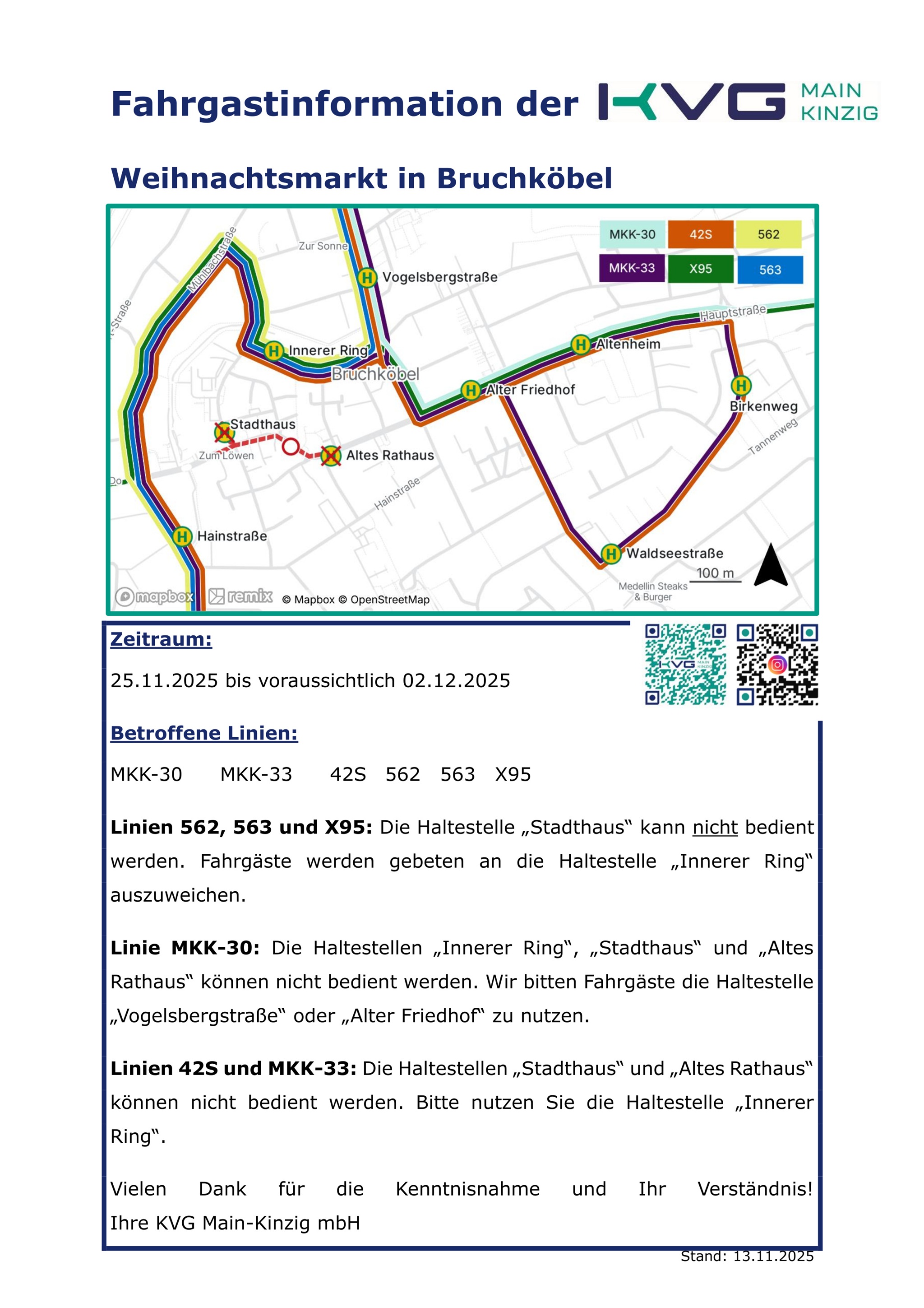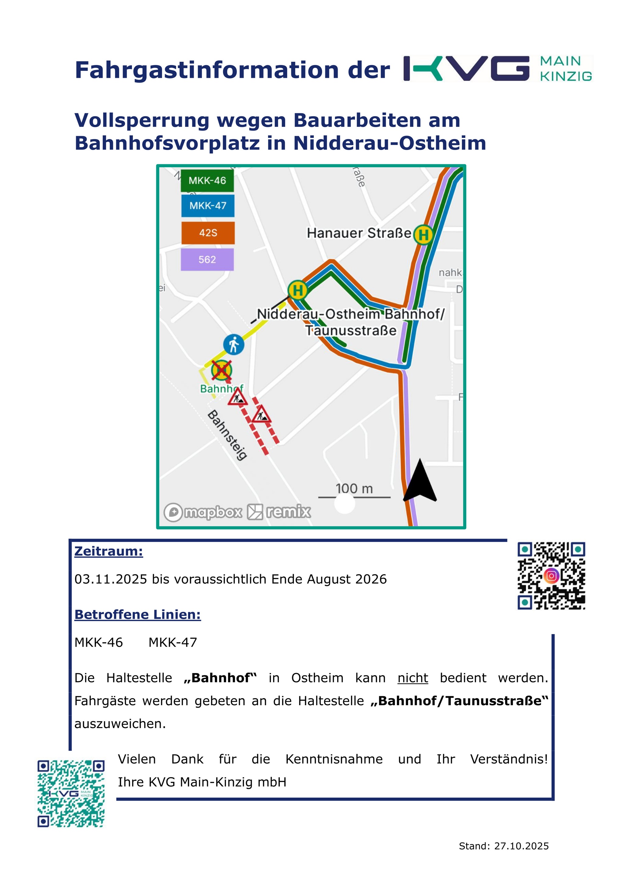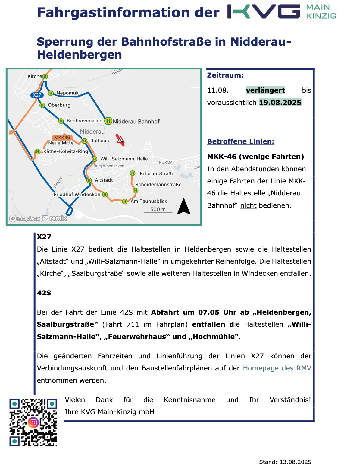 Eine Fahrgastinformation bezieht sich auf die Änderungen der Linie 563. Diese Änderungen treten bereits seit Samstag, den 16.08.2025 in Kraft und werden beibehalten. Die Änderungen der Linien 562 und 42S sind in einer weiteren Fahrgastinformation festgehalten. Die Baustellenfahrpläne sind auf der Homepage des RMV’s unter folgendem Link abrufbar: