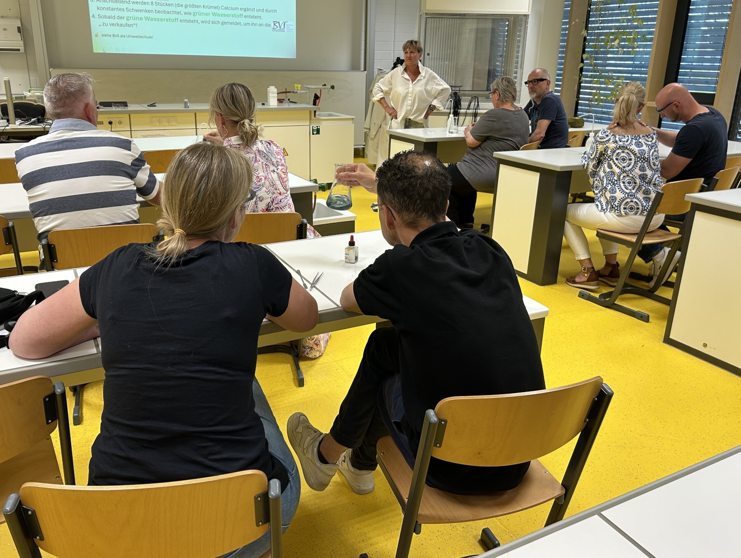 Ein besonderes Erlebnis ermöglichte Janet Woitzik, Klassenlehrerin der NaWi-Klasse 5h, den Eltern ihrer Klasse am Dienstag, den 29. April - sich einmal wieder als Schülerinnen und Schüler fühlen. An diesem Experimentierabend produzierten sie unter Anleitung der engagierten Naturwissenschaftlerin Wasserstoff und wiesen diesen nach. Anschließend wurden mit dem Brenner Glaskugeln hergestellt und anschließend versilbert. Mit großer Begeisterung und Tatendrang waren die Erwachsenen bei der Sache und konnten so einmal hautnah erfahren, welche spannenden Aktivitäten ihre Kinder im Profilschwerpunkt ”NaWi” erleben.