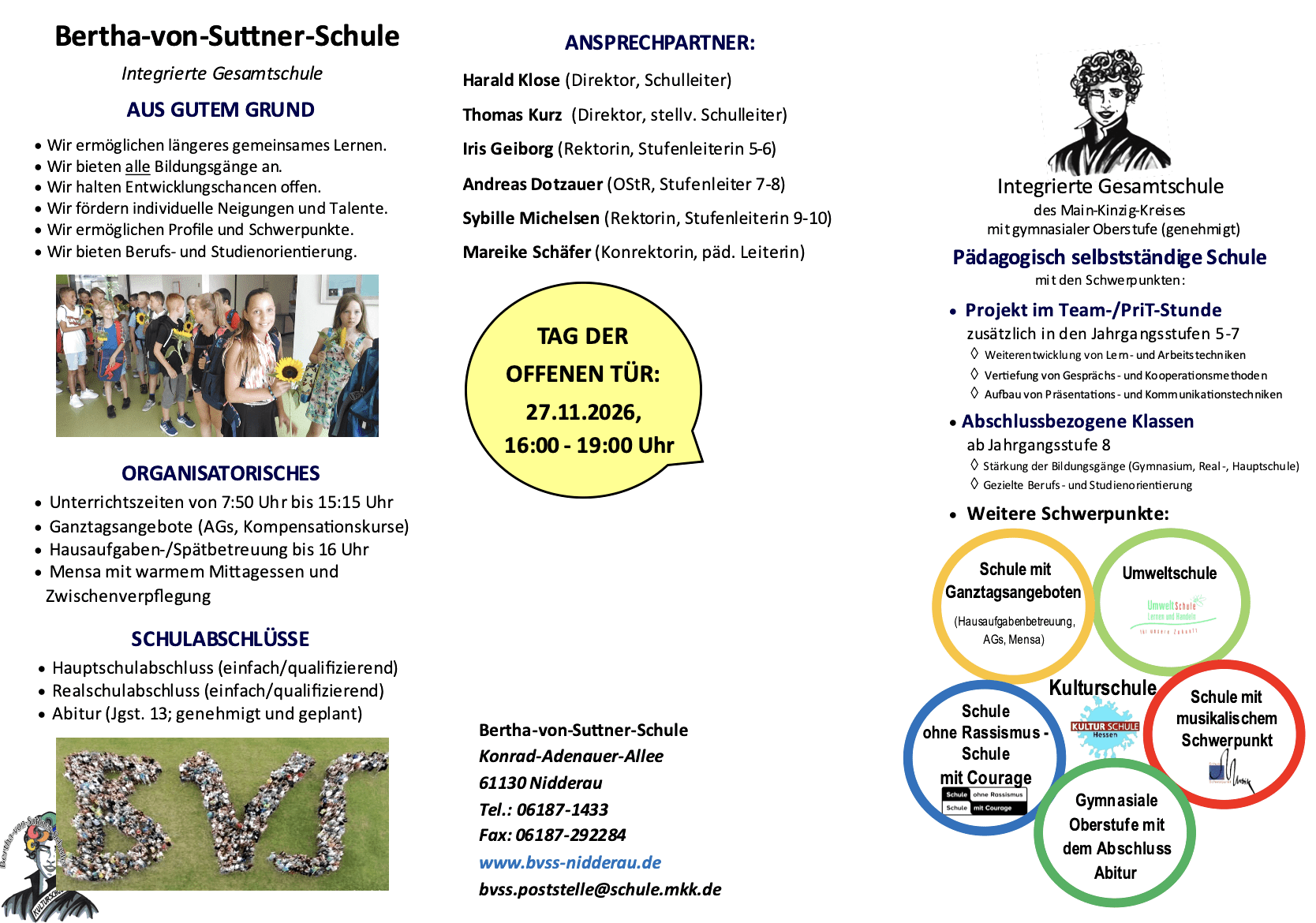 „… Eltern nehmen die Schule als einen Lebensraum wahr, in dem sich ihre Kinder entfalten und wohlfühlen können. Als Kulturschule bietet die Bertha-von-Suttner-Schule ein vielfältiges Angebot an inner- und außerschulischen Schwerpunkten (z. B. über Profilklassen), welches das schulische Leben bereichert und zur ganzheitlichen Entwicklung der Kinder beiträgt. Die zahlreichen Zertifizierungen manifestieren sich im Schulleben. Im Sinne einer Kultur des Miteinanders wird die Stärkung der Gemeinschaft gefördert, wobei jedoch auch die Individualität eines jeden Einzelnen Berücksichtigung findet und gestärkt wird. Des Weiteren wird seitens der Elternschaft die verstärkte Öffentlichkeitsarbeit, der schnelle Informationsfluss, die Offenheit für Impulse sowie das hohe Engagement auf Lehrkräfte- und Schulleitungs-ebene geschätzt. Die befragten Lernenden nehmen Qualitätsverbesserungen beispielsweise durch den verstärkten Einsatz digitaler Endgeräte oder der Reduzierung des Lärmpegels wahr. …“ (Evaluationsbericht , S. 9)