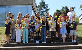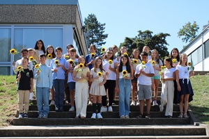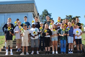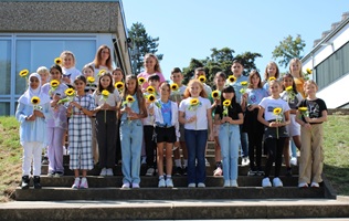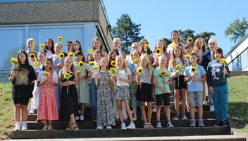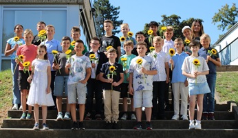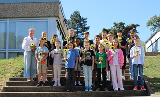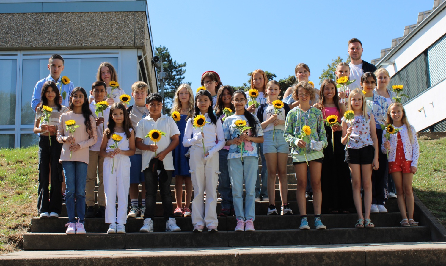 Sonnenblumen sehen aus, als würden sie den ganzen Tag lächeln. Welches Symbol wäre also besser geeignet, einen Schwung frischgebackener Fünftklässlerinnen und Fünftklässler mit Frohsinn, Zuwendung und menschlicher Wärme an der neuen Schule zu begrüßen? Die Blumen, die den Neuzugängen an ihrem ersten Tag an der Bertha-von-Suttner-Schule überreicht wurden, waren jedoch mehr als ein freundliches Willkommensgeschenk für die 184 Mädchen und Jungen, die sich gemeinsam mit ihren Eltern und anderen Angehörigen zur Einschulungsfeier in der Sporthalle versammelt hatten. Denn die Sonnenblume ist unter den sommerlichen Gartenpflanzen etwas ganz Besonderes, wie Schulleiter Harald Klose in seiner Begrüßungsrede erläuterte: „Die Blüte bleibt immer geöffnet, auch bei Regen. Sie strahlt jeden an, der sie anschaut, den Fröhlichen und den Traurigen.“ In dem Sinne, dass ganz gewiss auch an trüben Tagen hinter den Wolken versteckt irgendwo die Sonne scheine, wünschte der Direktor den Jüngsten der Bertha-Familie eine sonnige und erfolgreiche Schulzeit. Welchen Beitrag sie dazu selbst leisten können, hatte er ihnen zu Beginn seiner Rede bereits ans Herz gelegt: Ein von Respekt und Wertschätzung geprägtes Miteinander, Lernbereitschaft und als Triebfeder der Wunsch, Lehrkräften und Eltern mehr Freude als Sorgen zu bereiten, nannte er als Grundsätze für eine gelungene Schulzeit. Auch die Eltern nahm Harald Klose in die Pflicht und forderte sie auf, ihre Kinder sowohl zu unterstützen als ihnen gleichzeitig Grenzen zu setzen und besonders die Bildschirmzeit auf ein gesundes Maß zu reduzieren, damit der frisch erworbene Schulstoff nicht durch eine Flut digitaler Reize sofort wieder zerschossen wird. Die vielen gebotenen Möglichkeiten an der Bertha zu nutzen und zu erproben, dazu ermunterte Schulpfarrer Martin Beinhauer in seiner Ansprache die Kinder des neuen Jahrgangs Fünf. Auch er verwies auf die Sonnenblume, die den Regen aushält, statt sich zu verschließen. „Es gibt für alles eine Zeit. Jetzt ist die Zeit, wo ihr viele neue Sachen an unserer Schule ausprobieren könnt. Diskutiert und rechnet, experimentiert und redet in einer anderen Sprache, lernt ein Instrument und spielt mit anderen zusammen. Wer weiß, wann ihr so eine Gelegenheit wieder bekommt“, machte er den Jüngsten das Kommende schmackhaft. Die Schulelternbeiratsvorsitzende Tanja Zelenic versicherte den anwesenden Fünftklässler-Eltern, mit der „Bertha“ eine gute Wahl für ihre Kinder getroffen zu haben und forderte sie auf, die ihnen zur Verfügung stehenden Gestaltungsspielräume durch aktives Engagement in den verschieden Gremien wie Elternbeirat, Förderverein, Schulkonferenz und Schulbotschafterrat zu nutzen und damit an der Weiterentwicklung der Lernumgebung ihrer Kinder mitzuwirken. Auch Stufenleiterin Iris Geiborg begrüßte den neuen Schülerjahrgang, erläuterte die Abläufe in der Anfangsphase und stellte die neuen Klassenlehrerinnen und Klassenlehrer der acht Eingangsklassen vor. Neben der traditionellen Orchesterklasse verteilen sich die Mädchen und Jungen auf die Profilklassen „Sprache und Theater“, „Kunst“ und „Naturwissenschaften“. Die Klassenlehrkräfte, die am Ende der Einschulungsfeier ihre Schäfchen in Empfang und zum ersten Beschnuppern mit in die Unterrichtsräume nahmen, können in den ersten Wochen auf tatkräftige Hilfe aus dem eigenen Haus zählen: Bei dem schon bewährten Klassenpatenpatenprojekt begleiten eigens für diese Aufgabe ausgebildete Jugendliche des neunten Jahrgangs in den ersten Wochen des Schuljahres die jüngsten Mitschüler morgens von den Bushaltestellen und Bahnhöfen der umliegenden Orte bis zur Schule und mittags wieder zurück. Darüber hinaus unterstützen die Klassenpaten besonders während der ersten Tage und Wochen die Neulinge bei der Orientierung in der fremden Umgebung, erklären die noch ungewohnten Abläufe, stehen als Ansprechpartner zur Verfügung und greifen bei kleineren Konflikten schlichtend ein. Susanne Falk, 26. August 2024