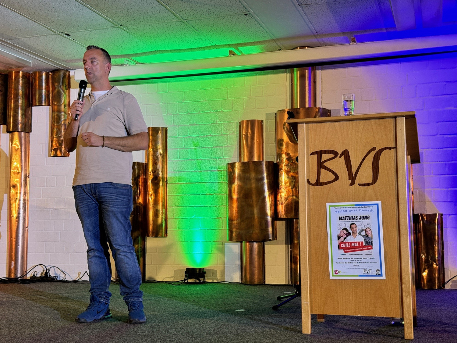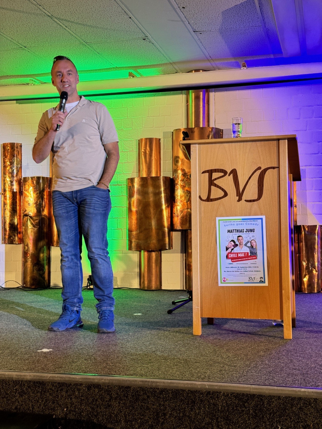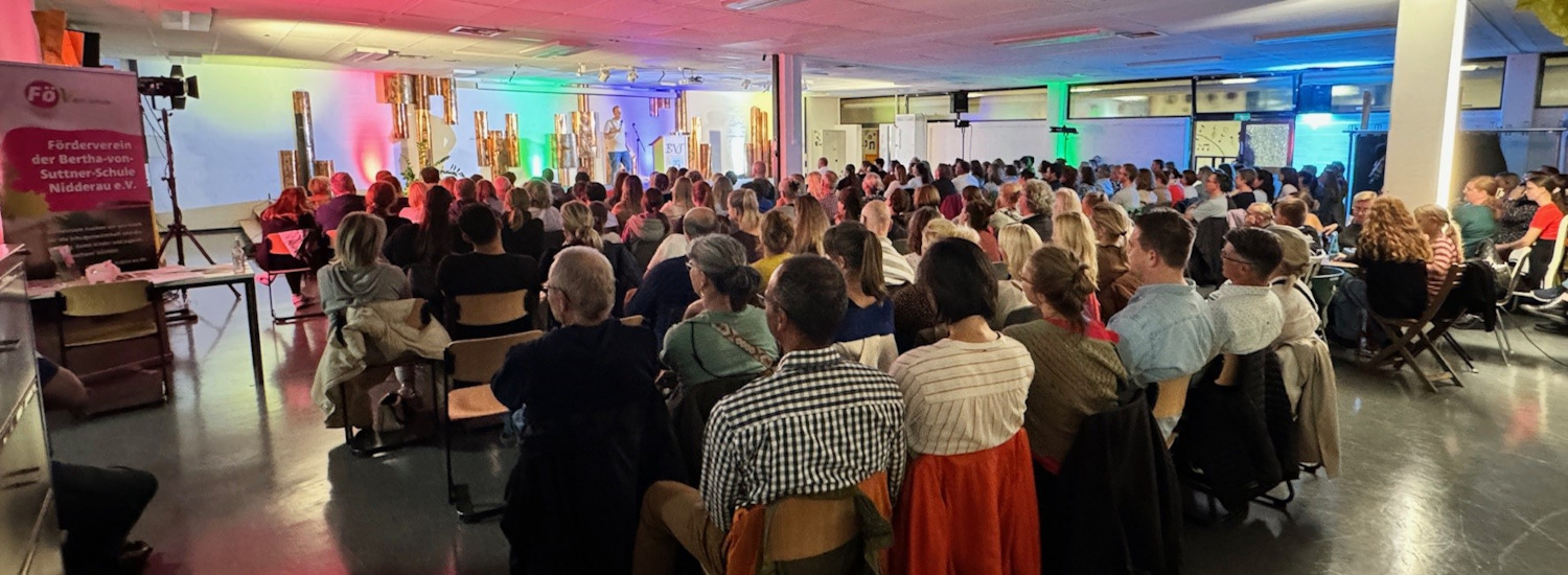 Mit einer fein abgestimmten Mischung aus wortwitziger Comedy, pädagogischer Analyse und biologischen Hintergrundinformationen holte Matthias Jung, Diplom-Pädagoge, Vater, Komiker und Autor, die leiderfahrenen Teenager-Eltern genau dort ab, wo sie nach ihrer letzten Auseinandersetzung mit dem Nachwuchs ratlos bis verzweifelt zurückgeblieben waren. Gleichermaßen humor- wie liebevoll leuchtete er die Konfrontationslinien aus, die sich zwischen Heranwachsenden und ihren Eltern ergeben, wenn der hormonelle Vulkan im pubertierenden Körper so richtig am Kochen ist. Für die Eltern im Publikum reihte sich ein Aha-Erlebnis an das andere und am Ende die tröstliche Erkenntnis: Wir sind nicht allein, in anderen Familien spielen sich exakt dieselben Dramen ab um Körperpflege, Essgewohnheiten, Hilfe im Haushalt, Vergesslichkeit, Kleidungsvorlieben und natürlich das Chaos im Kinderzimmer, wo der Jugendliche seiner Lieblingsbeschäftigung nachgeht, dem Chillen. Und wer sich bislang gefragt hatte, wie der Nachwuchs so ausdauernd mit Nichtstun im zugemüllten Kinderzimmer verbringen kann, bekam an diesem Abend die plausible Antwort: Er reift – was auch den Geruch im Zimmer erkläre. Abnabeln, diskutieren, rebellieren – wenn die Symptome des notwendigen Selbstfindungsprozesses die elterliche Geduld strapazieren, ist ruhig bleiben eine Kunst. Zumutungen und Beleidigungen dennoch mit Humor abzufangen, rät Mattias Jung, denn: „Wenn sie uns beleidigen, brauchen sie unsere Hilfe“, warb er um Verständnis für motzige und renitente Teenager. „Sie haben nichts gegen uns, sondern sie werden unter erschwerten hormonellen Bedingungen erwachsen.“ Leider komme bei den radikalen biochemischen Umbauprozessen des Gehirns der vernünftige Teil zum Schluss, so die wissenschaftliche Erklärung für die erstaunlichen und mitunter bestürzenden Wesensveränderungen, für die es immerhin einen Trost gebe: Das „Best off“ bleibe. Bis es soweit ist, sei es Aufgabe der Eltern, im Gespräch zu bleiben, die Kinder ernst zu nehmen, an die eigene Pubertät zu denken und Vertrauen zu haben. Denn: Es gibt einen Verbündeten in diesem schwierigen Prozess: „Die Zeit ist auf unserer Seite“, ermutigte Matthias Jung zum Abschluss des Vortrags seine Zuhörerschaft. Organisiert und finanziert wurde die Veranstaltung gemeinsam vom Förderverein und dem Schulelternbeirat mit dem Ziel, die Schulgemeinschaft zu stärken und innerhalb der Elternschaft nicht nur finanzielles Potenzial, sondern auch die möglicherweise noch schlummernde Bereitschaft für mehr ehrenamtliches Engagement in einem der schulischen Gremien zu aktivieren. Dass davon innerhalb der Bertha schon ganz viel vorhanden ist, bewies das bunte Drumherum, mit dem schuleigene Kräfte aus den Jahrgängen acht bis zehn die Veranstaltung zu einem gelungenen Gesamtpaket machten. Das Technik-Team von Jan Härterich sorgte für die professionelle Bühnenausleuchtung und eine störungsfrei abgestimmte Tonmischung, während die Achtklässler vom WPU „Schülercafè“ unter der Leitung von Sofia Santiago vor dem Auftritt und in der Pause die Wartezeit mit einem Angebot aus süßen Überraschungstüten und Knabbereien verkürzten.