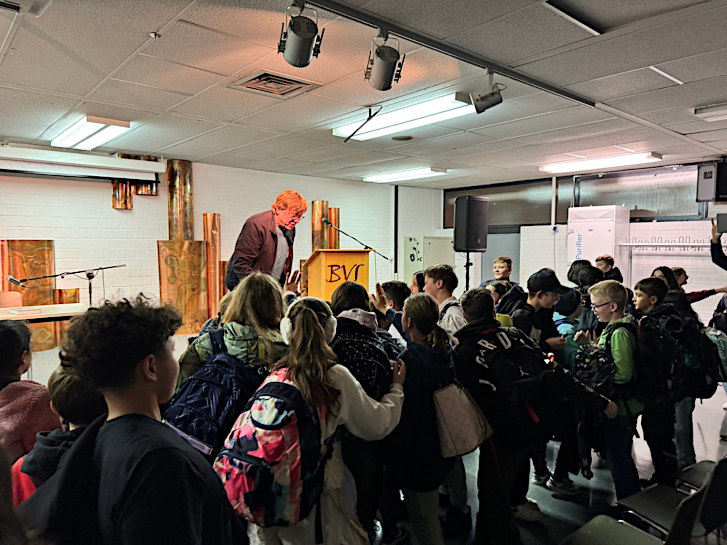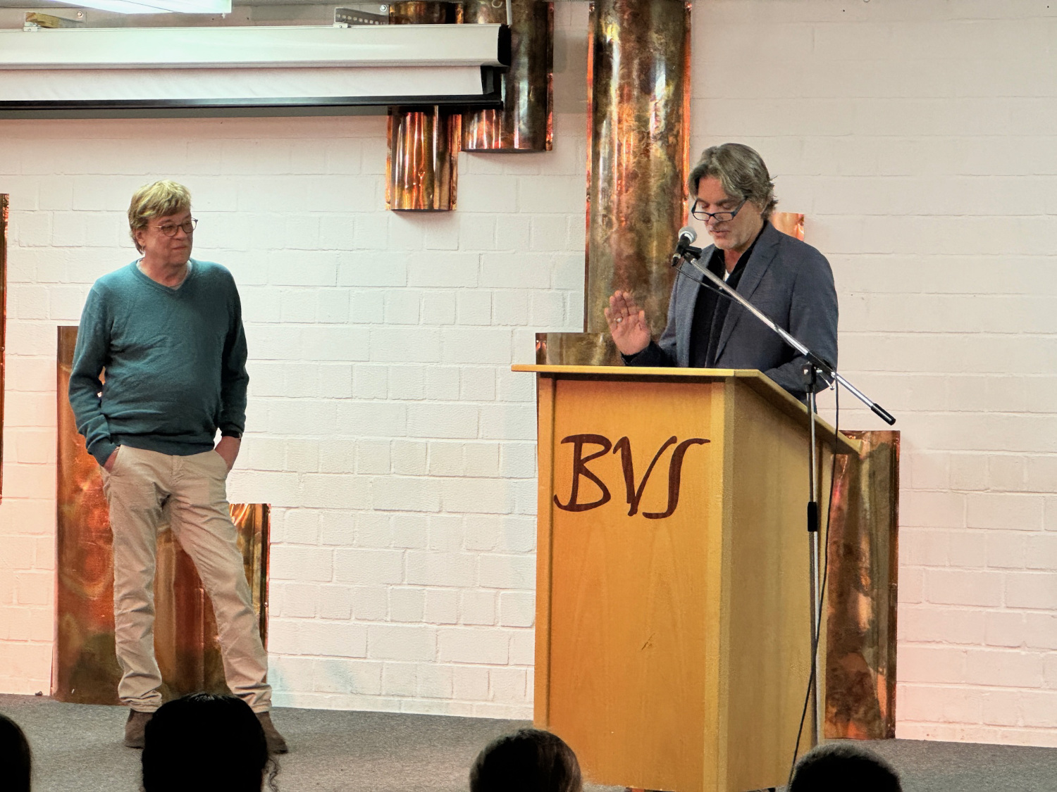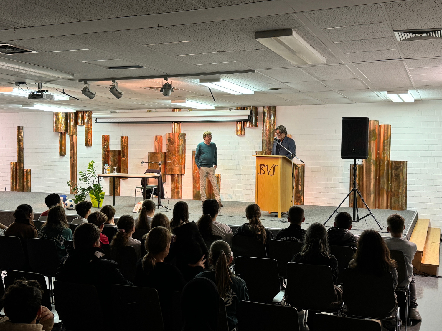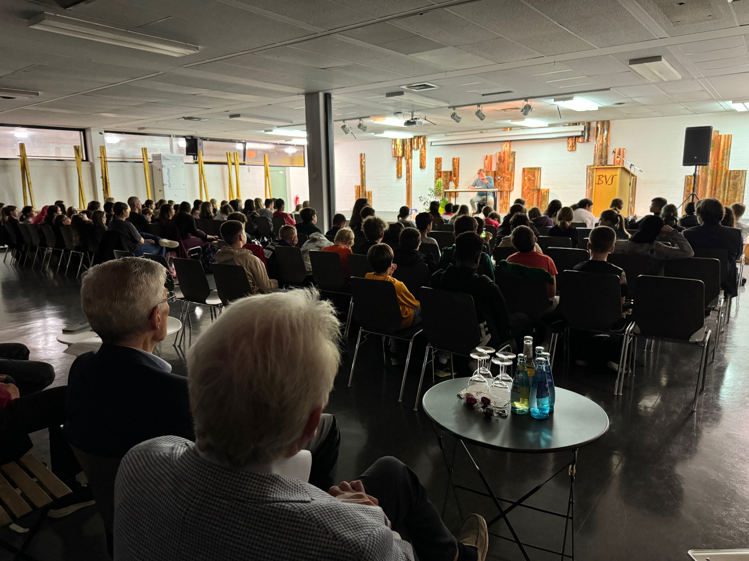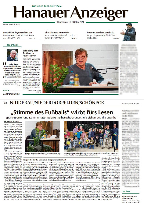 Béla Réthy war heute ehrenamtlich auf Vermittlung der Bürgerstiftung Nidderau zu Gast an der an der Bertha-von-Suttner-Schule in Nidderau. Auf Wunsch der schulischen Lesebeauftragten Laura Brieder und ihrer Kollegin Kerstin Petsch las der Gast aus dem Buch von Andreas Steinhöfel „Rico, Oskar und das Herzgebreche“ vor. Den rund 180 Schülern der 6. Klasse diente das als Einstieg in die Jahrgangslektüre und zugleich als Vorbereitung auf den Vorlesewettbewerb.In dem ausgewählten Buch dreht es sich nicht um Fußball, sondern um Abenteuer, Freundschaft, Toleranz und ein respektvolles Miteinander, was letztlich dann doch wieder gute Bezüge zum Sport und zu persönlichen Berichten ermöglichte.