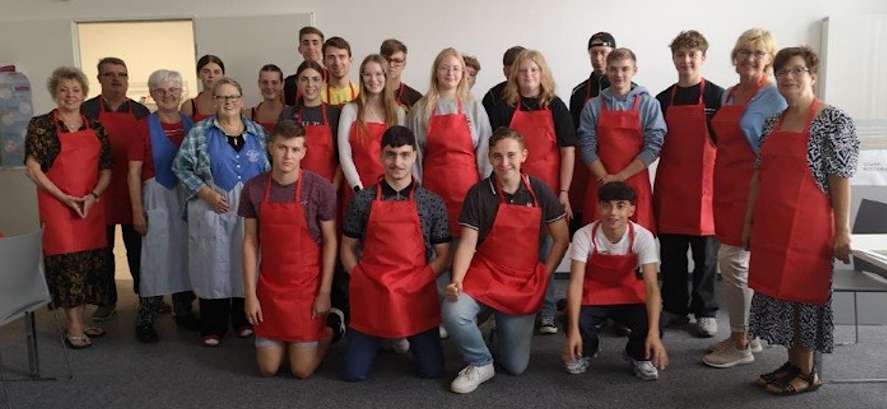 Schon eine Woche später hat das nächste Projekt im Familienzentrum der Stadt Nidderau stattgefunden. 18 Schülerinnen und Schüler des Wahlpflichtkurses „Umwelt-lernen“ haben mit den Landfrauen von Nidderau ein „klimabewusstes Mittagessen“ gekocht. Unter der Anleitung der Vorsitzenden des Landfrauenvereins, Rosel Bauer, und Ehrenamts-Lotsen haben die Schülerinnen und Schüler aus saisonalen und regionalen Lebensmittel eine leckere Mahlzeit hergestellt und anschließend gemeinsam gegessen.