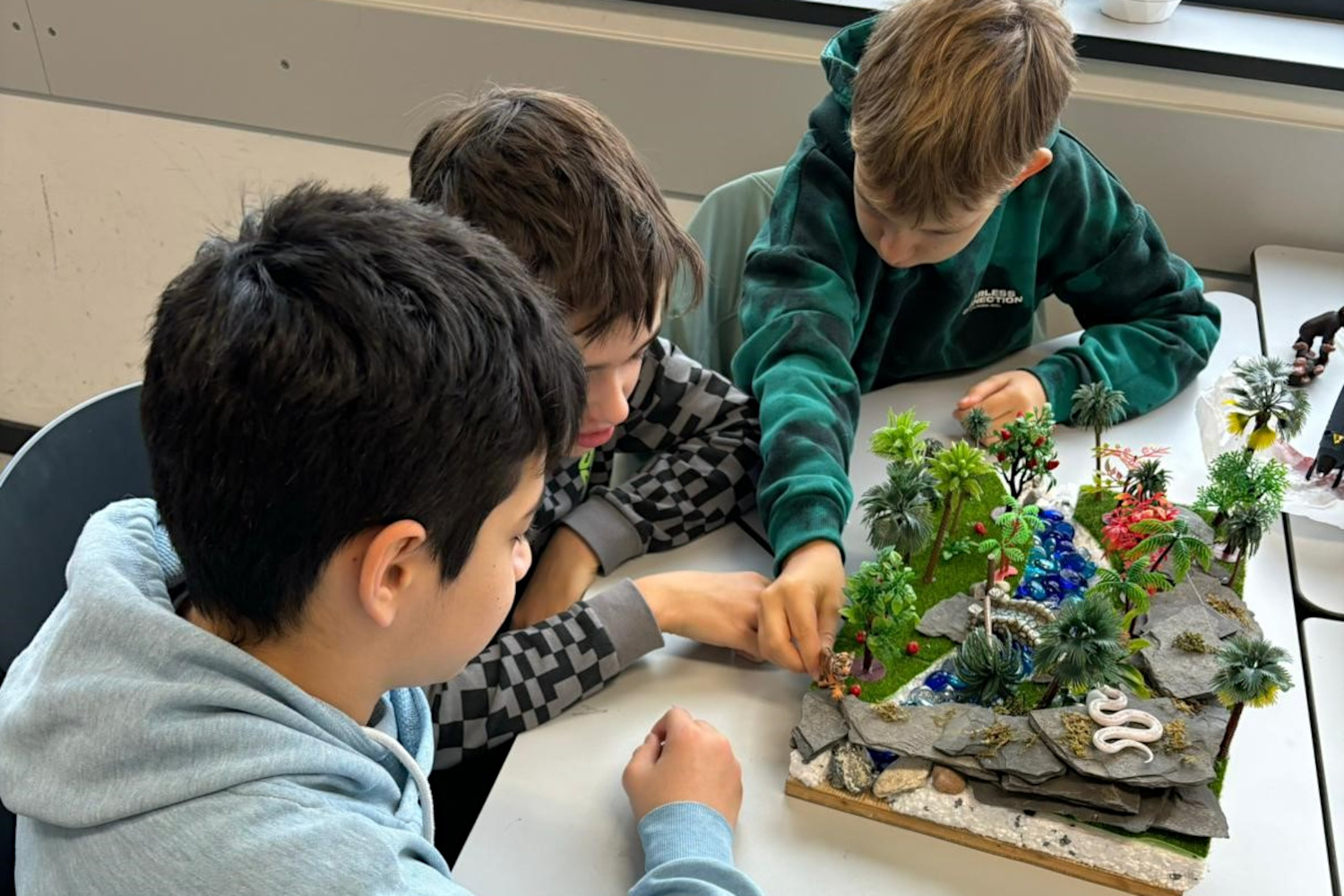 Zu Besuch in der Nawi-Klasse von Herrn Stefan Reuter wird dies besonders deutlich. Während eine Gruppe einen Dschungel gestaltet, bauen andere eine „LEGO-Figur“ aus Pappe oder entwickeln ein „Nawi-Monopoly“. Einige Mädchen sind mit der Planung eines PriT-Interviews beschäftigt, um aus allen Klassen ein Feedback zum Projektlernen einzuholen. Alle berichten stolz von dem Planungsprozess, den sie eigenverantwortlich vor der Durchführung durchlaufen haben. Eine Gruppe baut eine Stadt aus Pappe. Zunächst haben sie sich die Frage gestellt: „Wie können wir am einfachsten und stabilsten ein Haus aus Papier bauen?“ Die Antwort darauf gab ihnen der Mathematikunterricht. Hier haben sie Würfelnetze kennengelernt und dieses Wissen auf eine neue, praktische Situation übertragen. Und obwohl alle Teams an unterschiedlichen Projekten arbeiten, wird von ihnen der Bezug zu ihrem Profil bewusst geachtet. Präsentiert werden die einzelnen Projekte erst im Klassenverband, später auch im ganzen Jahrgang.