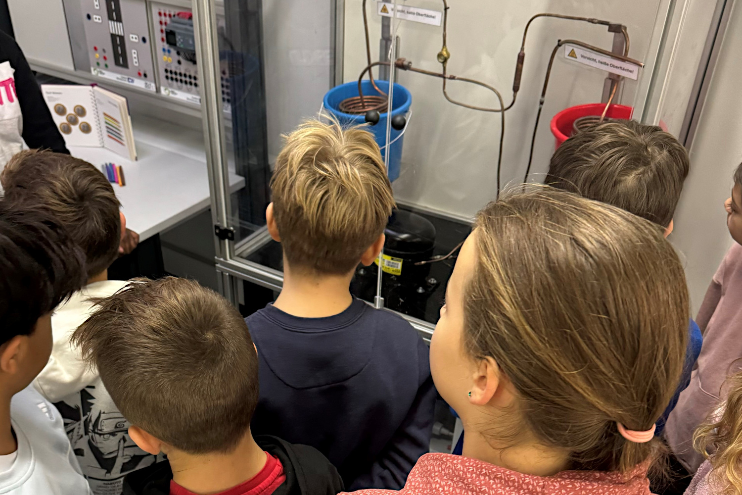 Bevor die jungen Besucher auf Entdeckungsreise gingen, erfuhren sie zunächst von MINT-Koordinator Matthias Stein, dass „MINT“ für Mathematik, Informatik, Naturwissenschaft und Technik steht. Er hatte gemeinsam mit den Lehrerinnen Justina Skiba und Valeria Rachor den Raum liebevoll für die Gäste vorbereitet: An vielfältigen Experimentierstationen konnten die 20 Schülerinnen und Schüler erkunden, wie z. B. eine Masse aus Speisestärke und Wasser reagiert oder wie die Leitfähigkeit von Limonade eine Uhr zum Leben erwecken lässt oder eine Wärmepumpe arbeitet.