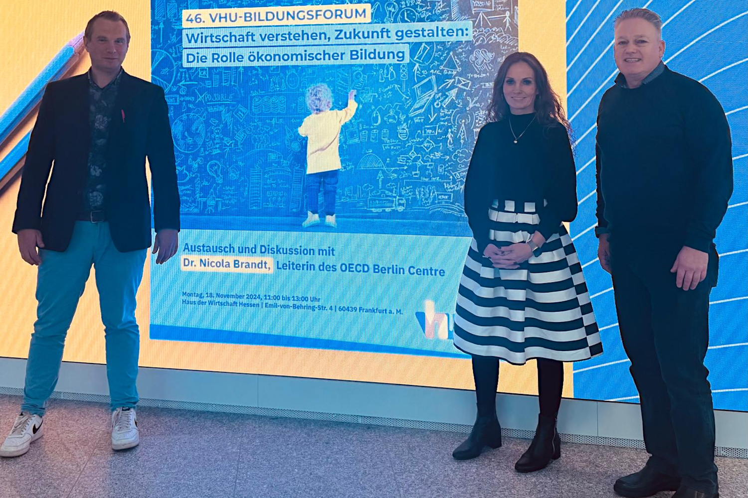 Beim Bildungsforum der Vereinigung der hessischen Unternehmerverbände (VhU) bildete sich jüngst die Schulleitung der Bertha-von-Suttner-Schule fort. Unter dem Motto „Wirtschaft verstehen, Zukunft gestalten“ diskutierte die Vereinigung der Hessischen Unternehmerverbände mit führenden Vertretern aus Bildung, Wirtschaft und Politik, wie in Zeiten von Digitalisierung und Globalisierung ökonomische Kompetenzen gestärkt werden können. Frau Dr. Nicola Brandt, Leiterin des Berliner Büros der Organisation für wirtschaftliche Zusammenarbeit und Entwicklung (OECD) stellte aktuelle Studien aus dem Bereich der Finanzbildung vor. Es folgte ein reger Austausch der Teilnehmerinnen und Teilnehmer, zu denen auch unsere pädagogische Koordinatorin Simone Studebaker, Stufenleiter und Berufsorientierungskoordinator Andreas Dotzauer sowie Schulleiter Harald Klose gehörten. Tenor der Veranstaltung war, dass die Bedeutung einer grundlegenden Finanzbildung vor dem Hintergrund der Globalisierung und Digitalisierung und sich rasant verändernder Wirtschaftsprozesse weiter zunehmen wird, jedoch nicht nur Aufgabe der Schule, sondern der gesamten Gesellschaft ist und alle Altersgruppen von der KiTa bis ins hohe Alter betrifft. Schon heute ist die Finanzbildung als besondere Erziehungs- und Bildungsaufgabe im Hessischen Schulgesetz verankert und schlägt sich in Themen des Fachs Gesellschafts-lehre (PoWi), bei der Bearbeitung des Berufswahlpasses oder der Berufswahl-App, Schülerfirmen wie dem Schüler-Café, der „Kontoführung“ der SV-Kasse und im Überschneidungsbereich vieler berufsorientierender Themen, aber auch mit Mathematikunterricht, man denke hier an die Prozent- und Zinsrechnung, nieder. Zum Abschluss des Forums forderte die VhU die Beteiligten auf, entschlossen zu handeln: „Vernetzung von Bildung und Wirtschaft muss weiter intensiviert werden, um jungen Menschen praxisnahe ökonomische Kompetenzen zu vermitteln. Dem möchte sich die Schulleitung der Bertha-von-Suttner-Schule gerne stellen und gegebene Impulse und Angebote, beispielsweise bei der weiteren Ausgestaltung des MINT-Zentrums aufgreifen.