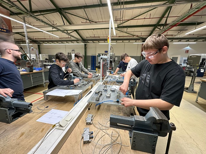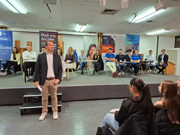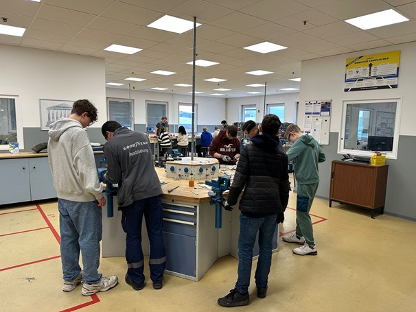 „Wofür brauche ich das eigentlich später mal?“ – Diese Frage stellen sich viele Schülerinnen und Schüler, denen Mathe und Physik im Unterricht zu abstrakt und lebensfremd erscheinen. Die Antwort: Für ziemlich coole Jobs in den Bereichen Mathematik, Informatik, Naturwissenschaften und Technik, kurz MINT. Und genau hier setzt das Projekt „I AM MINT“ an, das die Bertha-von-Suttner-Schule bereits zum achten Mal für die neunte Jahrgangsstufe durchführte, organisiert von Studien- und Berufskoordinator Andreas Dotzauer. Mit spannenden Einblicken und praktischen Erlebnissen will das Projekt Lust auf Berufe machen, die aktuell dringend Fachkräfte suchen. Denn in MINT-Berufen stehen derzeit die Chancen auf eine Ausbildung und einen krisenfesten Arbeitsplatz mehr als gut. Los ging’s mit dem Format „Azubi-Talks“, bei dem Auszubildende verschiedener Firmen den Schülerinnen und Schülern direkt aus ihrem Berufsalltag erzählten. Die Jugendlichen lernten bei dieser Veranstaltung sechs unterschiedliche Unternehmen in einer Art „Speeddatingprozess“ kennen, indem sie im halbstündigen Wechsel die Firmenvertreter in ihren Räumen besuchten und dort die Azubis mit Fragen rund um die Ausbildung und den Berufsweg löcherten. Zu Gast in der „Bertha“ waren an diesem Tag die Firmen Bruker EAS GmbH, DM-Drogerie-Markt GmbH & Co. KG, das Finanzamt Hanau, Ille Papier-Service GmbH, LPL Projects + Logistics GmbH sowie VIBRANTZ Technologies. Für 16 Schülerinnen und Schüler folgte wenige Tage darauf als Highlight ein Besuch bei der Firma Dunlop in Hanau. Hier durften die Jugendlichen zusammen mit ihrer Lehrerin Justina Skiba-Bousonville nicht nur zuschauen, sondern in der Ausbildungswerkstatt selbst Hand anlegen: Pneumatische Vorrichtungen bauen, ein Starkstromkabel zusammenstecken oder erste Handgriffe im Elektrohandwerk ausprobieren. Dabei merkten sie schnell: Technik kann nicht nur spannend sein, sondern auch jede Menge Spaß machen. Und möglicherweise hat der eine oder die andere bei diesem Projekt nicht nur ganz neue Perspektiven in der persönlichen Berufswegeplanung entdeckt, sondern auch einen anderen Blick auf die naturwissenschaftlichen Unterrichtsfächer gewonnen.