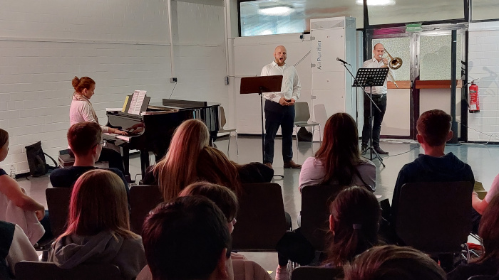 Von der Zeit des Barock bis in die Gegenwart ging die musikalische Zeitreise, die die Orchesterklassen und Musikschüler aus den Jahrgängen Fünf, Sechs, Neun und Zehn der Bertha-von Suttner-Schule erlebten. Die Pianistin Kristina Ruge, der Posaunist Roman Bozzetta und der Tenorsänger Johannes Lehner präsentierten Kompositionen von Händel und Mozart, Weber und Schumann, Bernstein und Anthony Newley. Unterhaltsam und lebendig führte Tenorsänger Johannes Lehner durch das Programm und verknüpfte geschickt die jeweiligen geschichtlichen Hintergründe mit dem herrschenden Zeitgeist in Mode und Musik. Veranstalter des Hörerlebnisses war die gemeinnützige Internationale Stiftung zur Förderung von Kultur und Zivilisation aus München, die unter dem Motto „Musizieren statt Konsumieren“ dem musikalischen Nachwuchs Begegnungen mit klassischer Musik und professionellen Künstlerinnen und Künstlern ermöglicht. Das Stiftungsprojekt umfasst im Verlauf von zwei Jahren insgesamt vier solcher Live-Konzerte in der Schule und soll dazu beitragen, die Begeisterung der Jugendlichen für das Musizieren wachzuhalten. S. Falk, 3.06.2023
