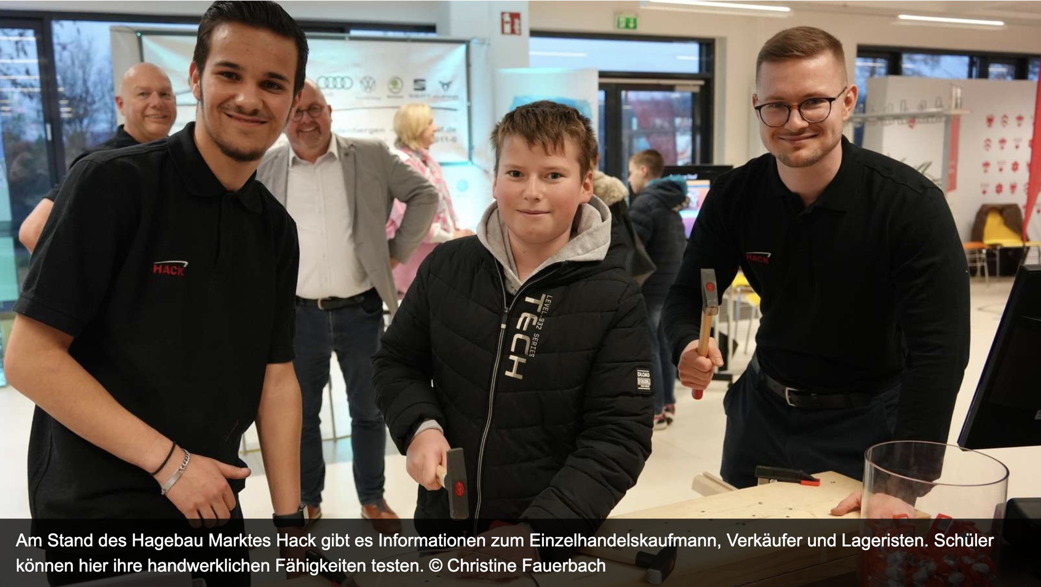 Einen Nagel mit einem Hammer gerade in ein Brett zu schlagen, ist nicht so einfach, wie es aussieht. Das merkten Schüler wie der Neuntklässler Maximilian Thiele schnell am Stand des Hagebau Marktes Hack. Hier informierten Lagerist Giuliano Saba und Julian Oberland, Verkäufer Baustoffhandel, über die Ausbildungsberufe Einzelhandelskaufmann, Verkäufer und Lagerist. Wer wollte, konnte sich über viele weitere Ausbildungsberufe in unterschiedlichen Branchen informieren wie auch über Kulturangebote für Jugendliche in Nidderau. „Die Veranstaltung ist gut. Es wurden Berufe vorgestellt, über die wir uns noch nie Gedanken gemacht haben“, bilanzierten zwei Schülerinnen nach einem Rundgang.