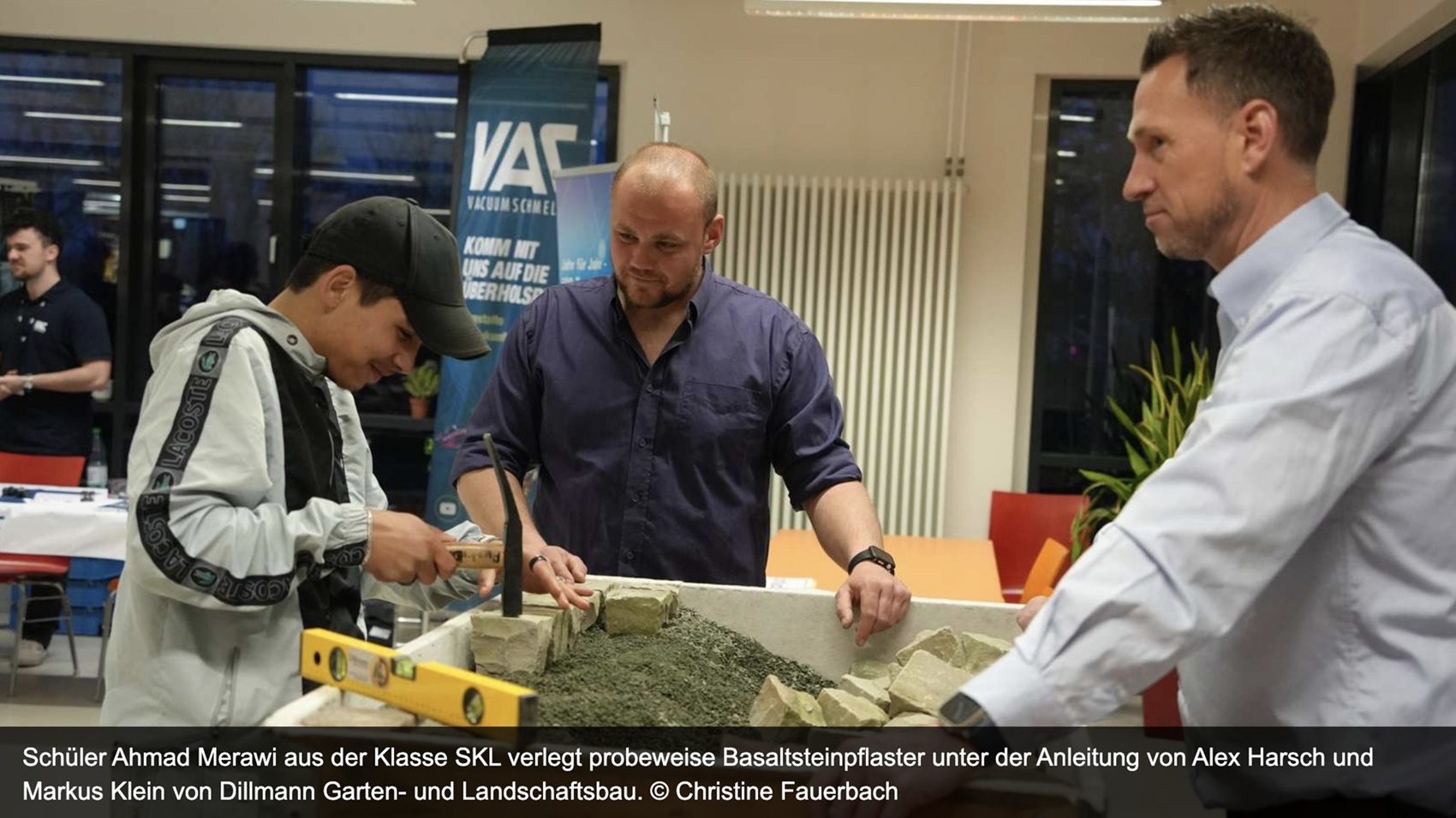 Über den Beruf des Steuerfachangestellten, dessen Ausbildung zweieinhalb bis drei Jahre dauert, informierten die Schüler Lionel, Elodien und Ilayda Steuerberater Björn Schubert und Christina Zirkel von der Steuerberatung Schubert. Mitarbeiter des Fachdienstes Personalwesen der Stadt Nidderau hatten Informationen zu Ausbildungsberufen in ganz unterschiedlichen Bereichen. Dazu gehörten Ausbildungen im Bereich Umwelttechnologie und Abwasserbewirtschaftung, zum Fachangestellten für Bäder oder für Medien und Informationsdienste, zum Verwaltungsfachangestellten und zum Erzieher.Für alle, die gerne in der Natur arbeiten, gestalten und kreativ sein wollen, könnte eine vielseitige Ausbildung zum Landschaftsgärtner bei Dillmann Garten- und Landschaftsbau interessant sein. Unter Anleitung von Meister und Ausbilder Alex Harsch und Ausbilder und Bauleiter Markus Klein konnten Schüler wie Ahmad Merawi aus der Klasse SKL ihre praktischen Fähigkeiten beim Verlegen von Basaltsteinpflaster testen.