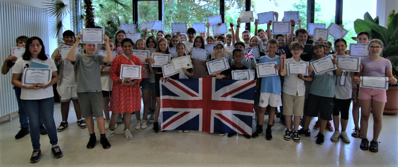 Diplome und Sachpreise gab es für fünfzig Mädchen und Jungen der Bertha-von-Suttner-Schule Nidderau, die an dem internationalen Englischwettbewerb „The Big Challenge“ teilgenommen hatten. Die alljährlich im Mai stattfindende Sprach-Olympiade richtet sich an Schülerinnen und Schüler der Jahrgänge 5 bis 8, die ihr Englisch auf spielerische Weise verbessern möchten, und wird auf nationaler wie europäischer Ebene ausgetragen. An der Bertha-von-Suttner-Schule gehört die Teilnahme am „Big Challenge“ bereits zur Tradition. Nach den wochenlang und voller Spannung erwarteten Ergebnissen erhielten die jungen Sprachprofis nun endlich die verdienten Belohnungen für ihren erfolgreichen Einsatz. Neben Zertifikaten, Postern, Stiften und Postkarten gab es weitere Preise für alle Teilnehmer, darunter etwa eine Powerbank, Kalender, Flaggen und englischsprachige Lektüren. Als Anerkennung für besonders herausragende Leistungen konnten einige der Fremdsprachen-Champions sogar eine Medaille aus den Händen von Fabian Heidlberger vom Fachbereich Englisch entgegennehmen. Alle Lernenden beglückwünschten sich gegenseitig und freuten sich über die attraktiven Preise, die sie sich selbst aussuchen durften. Jahrgangsbeste und gleichzeitig Schulsiegerin war Teresa Esser aus dem Jahrgang 5. Sie belegte hessenweit Platz 15 von 518 und deutschlandweit Platz 126 bei insgesamt mehr als 13000 Teilnehmerinnen und Teilnehmern ihrer Jahrgangsstufe. Die besten der übrigen Jahrgänge waren Shia Dad (Klasse 6), Dusan Zivkovic (Klasse 7) und Tyler Hogenkamp (Klasse 8). S. Falk, F. Heidlberger, 18.07 2023
