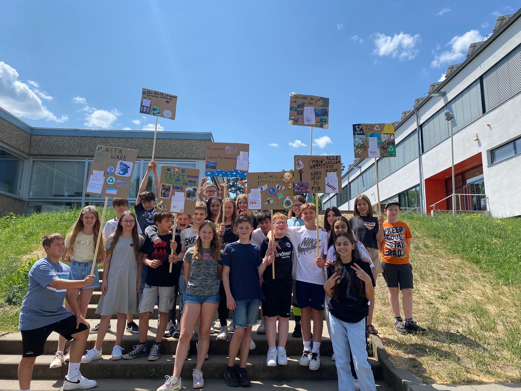 Die Schülerinnen und Schüler der 6a entwarfen gemeinsam im GL-Unterricht Plakate zum Thema Umweltschutz. Für die Gestaltung dieser Plakate haben die Schülerinnen und Schüler viele Ideen gesammelt und sich hierbei von der Fridays-for-Future-Bewegung inspirieren lassen. Mithilfe von aussagekräftigen Slogans, passenden Bildern und Materialien, die sie teilweise auf dem Schulhof gefunden haben, wollen sie auf derzeitige Umweltprobleme aufmerksam machen. Die selbstentworfenen Flyer informieren über ihr Anliegen und nennen Handlungsmöglichkeiten, die wir alle haben, um die Probleme zu minimieren. Angesprochene Themenfelder sind: weniger Verwendung von Plastik, Müllvermeidung, Mülltrennung und Recycling, nachhaltige Mobilität und die Auswirkungen von Plastik auf Meerestiere.