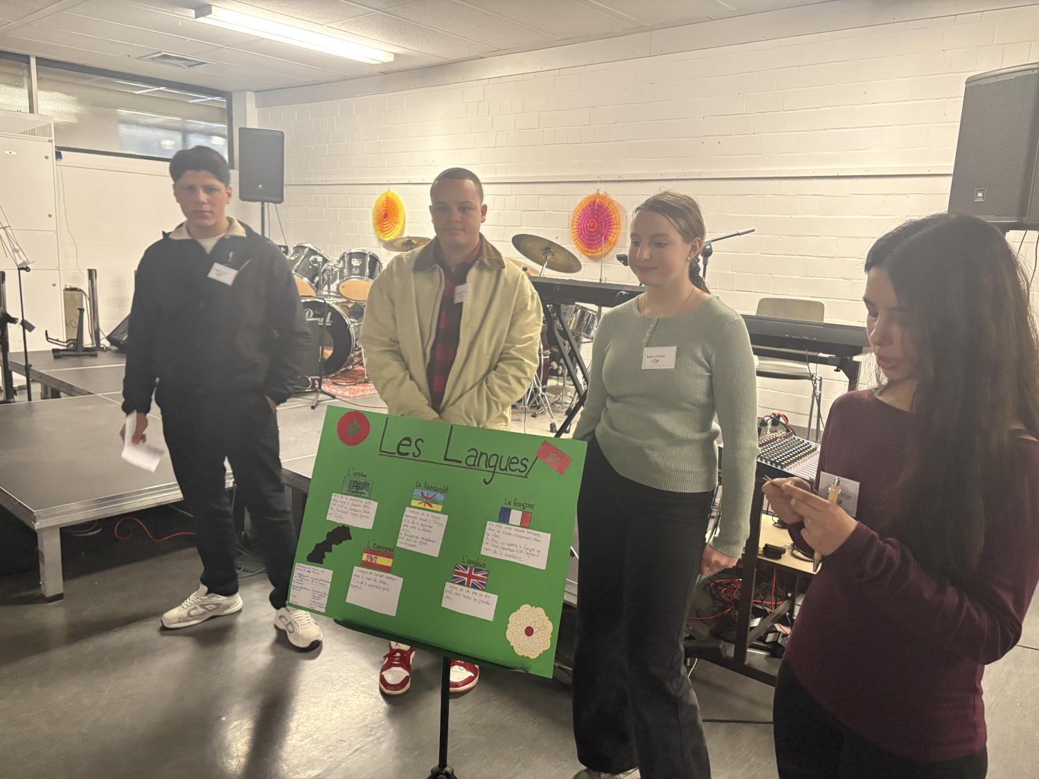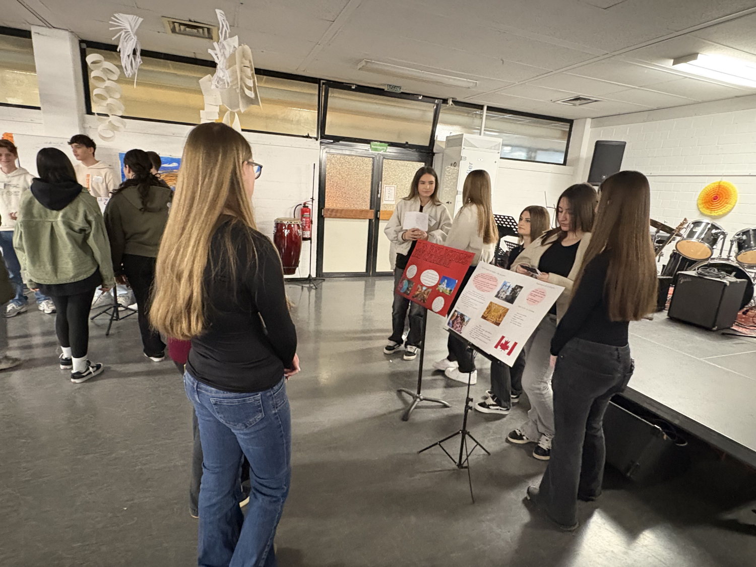 Die Schülerinnen und Schüler der Jahrgangsstufe 9 und 10 recherchierten in Vorbereitung auf den Projekttag eigenständig verschiedene Schwerpunkte zu den beiden französischsprachigen Ländern und bereiteten ihre Ergebnisse mithilfe kreativ gestalteter Plakate auf. Nach einer gemeinsamen Eröffnung und Kennenlernphase präsentierten sie sich ihre Ergebnisse gegenseitig auf Französisch. So wurden beispielsweise typische Musik, landestypische Gerichte sowie traditionelle Bräuche und Lebensweisen vorgestellt. Auf diese Weise erlebten die Teilnehmenden, wie vielfältig Französisch gesprochen und gelebt wird – und konnten gleichzeitig üben, ihr Wissen lebendig zu vermitteln. Passend dazu konnten die Schülerinnen und Schüler französische Snacks sowie kanadischen Ahornsirup genießen, die den Projekttag auch kulinarisch bereicherten. Französische Musik im Hintergrund sorgte zusätzlich für eine authentische und stimmungsvolle Atmosphäre.