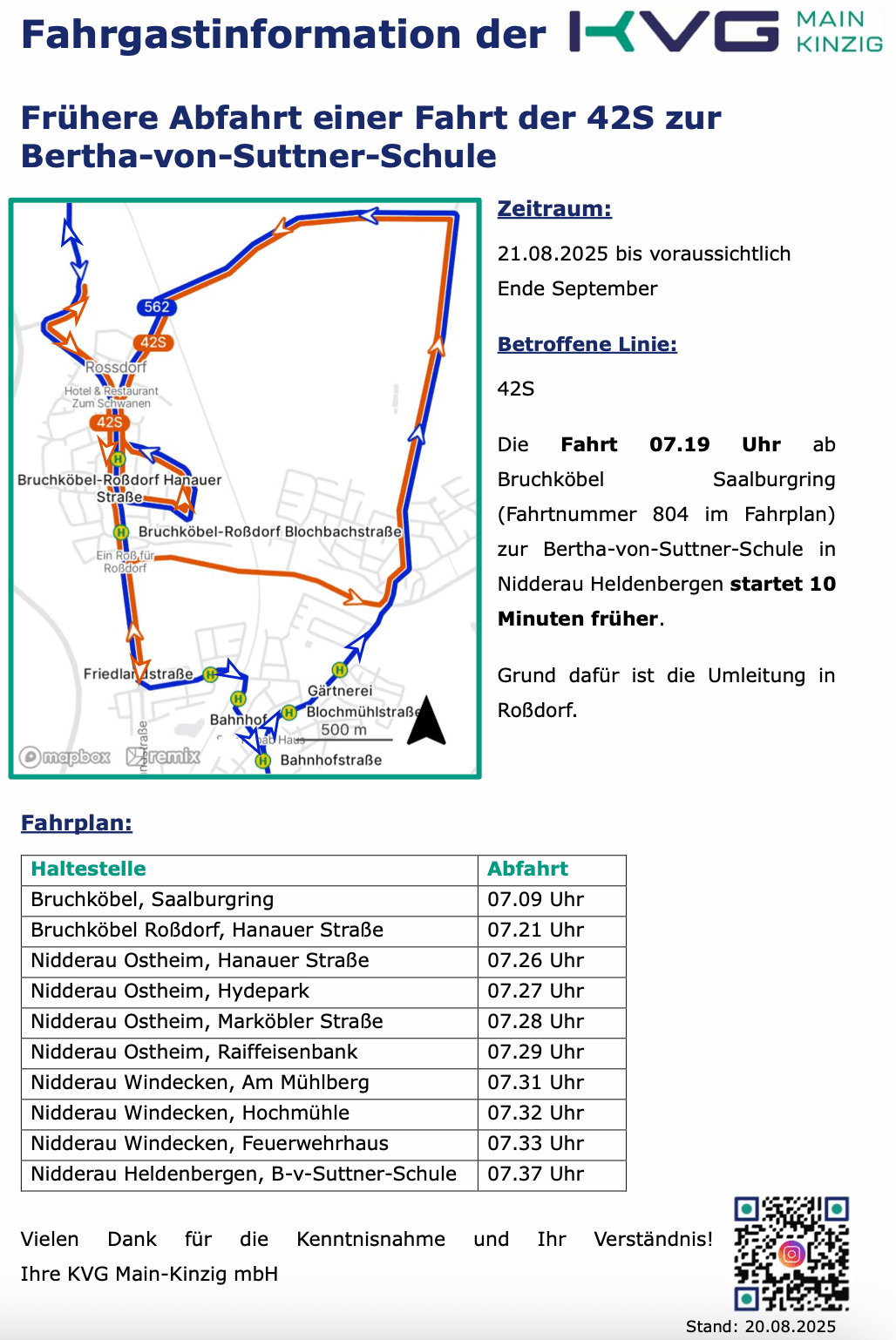 für ein pünktliches Eintreffen der Schüler und Schülerinnen der Bertha-von-Suttner-Schule zu Schulbeginn wird eine Fahrt der Linie 42S ab morgen, dem 21.08.2025 früher starten. Grund dafür sind die längeren Fahrzeiten auf der Umleitungsstrecke während des nächsten Bauabschnittes der L 3195 zwischen Roßdorf und Bruchköbel.