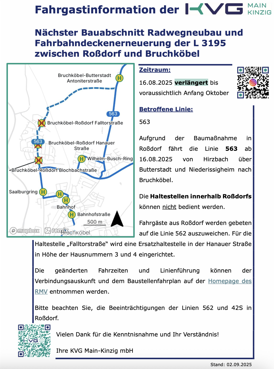 Eine Fahrgastinformation bezieht sich auf die Änderungen der Linie 563. Diese Änderungen treten bereits seit Samstag, den 16.08.2025 in Kraft und werden beibehalten. Die Änderungen der Linien 562 und 42S sind in einer weiteren Fahrgastinformation festgehalten. Die Baustellenfahrpläne sind auf der Homepage des RMV’s unter folgendem Link abrufbar: