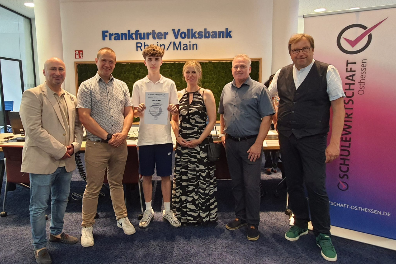 Auf dem Foto: Kian (Mitte) mit seiner Mutter, Berufs- und Studienkoordinator Andreas Dotzauer und Schulleiter Harald Klose sowie die beiden Juroren des Arbeitskreises SchuleWirtschaft Mesut Bütev (links) und Joachim Bauer (rechts