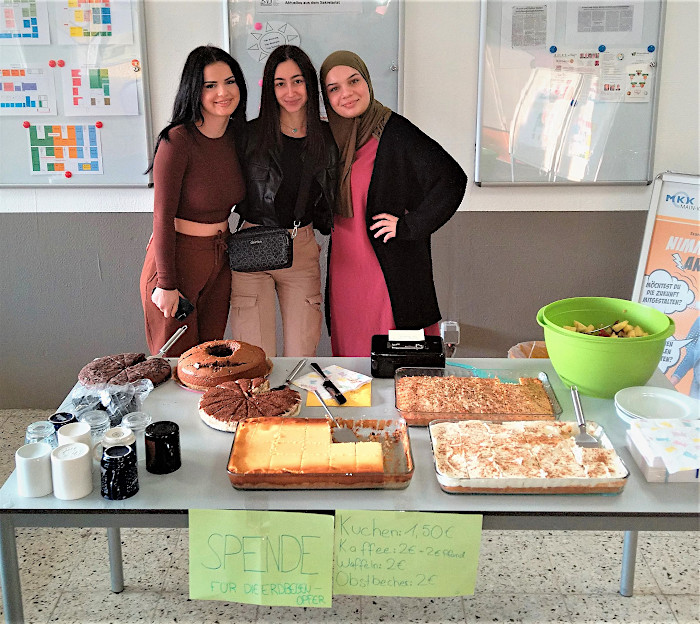 Die Nachrichten über das verheerende Erdbeben in der Türkei und in Syrien haben auch an der Bertha-von-Suttner-Schule große Betroffenheit ausgelöst. Eine spontane Hilfsaktion, initiiert von der Schülerin Gamze Azlan aus der 9B2, erbrachte eine stattliche Summe aus Spendengeldern und dem Erlös eines Kuchenverkaufs. Gamze und ihre Mitschülerinnen Leila Doukry, Sila Basustaoglu, Agnesa Haziri, Ezra Haziri und Aleyna Kocatürk verteilten zunächst handgeschriebene Spendenaufrufe in den Fluren und an den Eingängen und informierten über die Lautsprecheranlage der Schule in mehreren Sprachen über die Notlage im Erdbebengebiet. Um der Spendenbereitschaft noch ein wenig auf die Sprünge zu helfen, verkauften die Schülerinnen in der Pause frische Waffeln und selbst gebackenen Kuchen. Schulpfarrer Martin Beinhauer, der die Aktion betreute und unterstützte, äußerte sich beindruckt vom Engagement der Mädchen und verwies stolz auf das stattliche Ergebnis von 1400 Euro, die zu gleichen Teilen an die Erdbebenhilfe des Roten Kreuzes und die türkische Hilfsorganisation Kizilay überwiesen wurden.