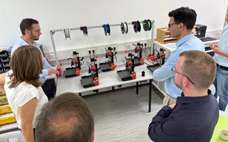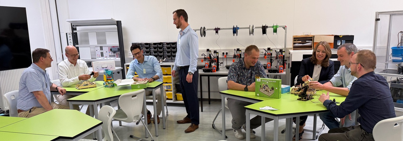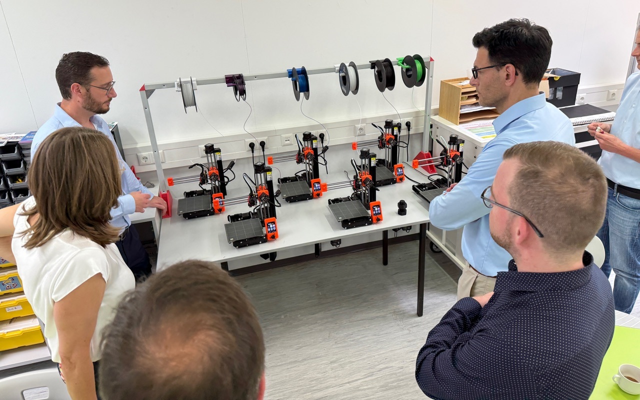 Kürzlich besuchte eine Delegation von sechs Wirtschaftsvertreterinnen und -vertretern das MINT-Zentrum Nidderau. Eingeladen hatten die Bertha-von-Suttner-Schule gemeinsam mit Hessens größtem Ausbildungsunternehmen Provadis, welches MINT-Zentren unter anderem zusammen mit der IHK-Frankfurt an vier seiner Partnerschulen in deren Aufbau begleitet und diese in der kontinuierlichen Bildungsarbeit durch Workshops für Schülerinnen und Schüler unterstützt.