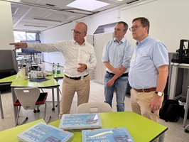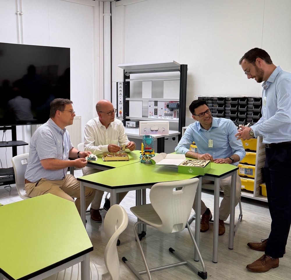 Da SchuleWirtschaft Hessen als Teil der Vereinigung der hessischen Unternehmerverbände in allen Regionen Hessens durch vielfältige Angebote Brücken zwischen Lehrkräften und Wirtschaftsunternehmen schlägt, lag es nahe, dass sich Landesgeschäftsführer Matthias Rust und seine Kollegen Michael Reitz und Roland Boros aus den Regionen Mittelhessen, Main-Taunus sowie Wiesbaden-Rheingau einmal eines der MINT-Zentren in Aktion ansehen. Ebenfalls gekommen war Claudia Merk, die beim Bildungswerk der Hessischen Wirtschaft u.a. das Projekt I AM MINT koordiniert.